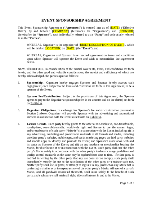 An event sponsorship agreement is a contract between an event organizer and a sponsor that outlines the terms under which the sponsor will support the event, typically through financial contributions, provision of goods or services (in-kind sponsorship), or promotional support. This type of agreement is fundamental to various events, including sports competitions, conferences, festivals, charity fundraisers, and cultural exhibitions, facilitating a mutually beneficial relationship between the event and the sponsor.