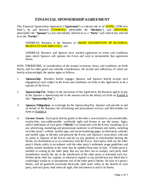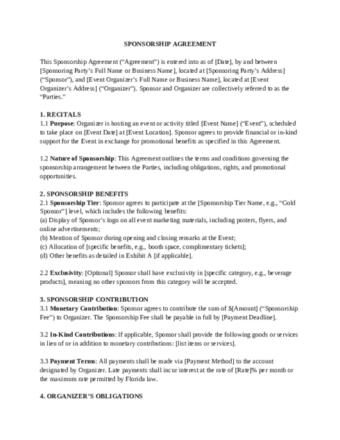 A financial sponsorship agreement is a formal contract between a sponsor (typically a business or corporation) and another party (which can be an individual, event, team, or organization) where the sponsor provides monetary support in exchange for advertising or promotional opportunities. These agreements are common in sports, arts, events, and charitable activities, where the financial contribution from the sponsor helps fund the other party's activities in return for exposure, branding, and marketing benefits aligned with the sponsor's business objectives.