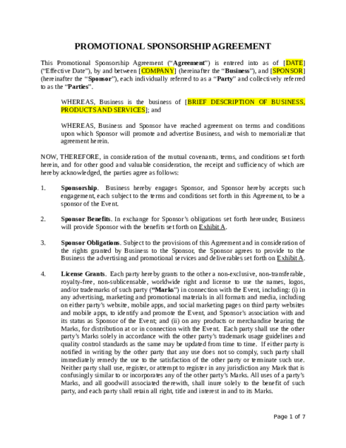 A promotional sponsorship agreement is a specific type of sponsorship arrangement focused primarily on marketing and promotional activities. In this setup, a sponsor provides support to another party (which could be an individual, event, organization, or team) in exchange for opportunities to promote their brand, products, or services. Unlike a financial sponsorship agreement, which involves direct monetary support, a promotional sponsorship can encompass a variety of support forms including financial, in-kind contributions, or services, with a strong emphasis on marketing benefits.