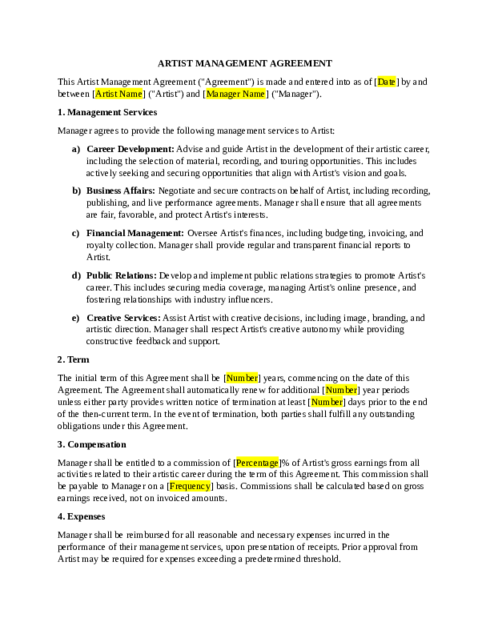 An artist management contract between an artist and a gallery is a formal agreement that outlines the terms and conditions under which the gallery will manage aspects of the artist's career. These contracts are pivotal for both parties as they lay down the groundwork for their professional relationship, including the promotion, exhibition, and sale of the artist's works.
